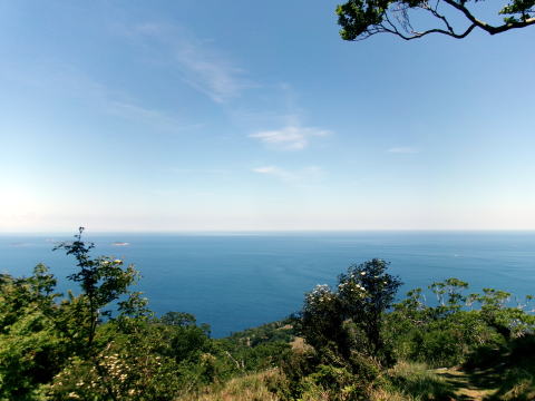 | 頂上からの展望はよくないが、近くの太平洋が望めるところがある。天気もよく素晴らしい展望だった。 周回コースを予定していたが、私を含む3人は往復コースとなった。天気が良すぎて、いつものように軽い熱中症にかかり調子があまりよくないのでそのまま下山とした。 |
