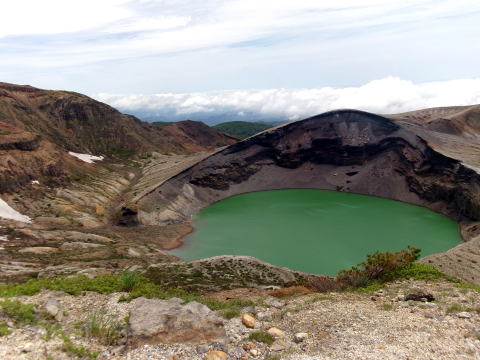 | 蔵王山という山はない。最高峰は熊野岳だ。熊野岳に向かう途中、やや下ったところにお釜の近くまで行ける展望所がある。いつ来ても、雄大な火口湖に圧倒される。 |