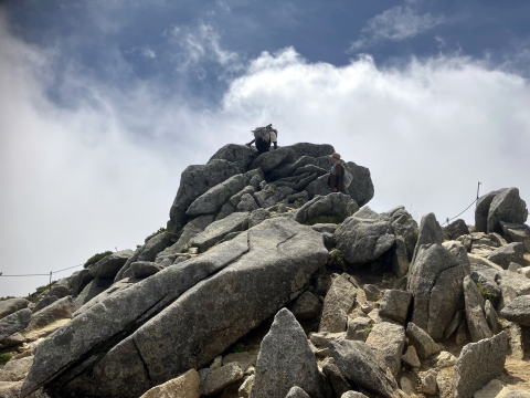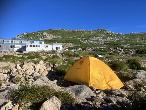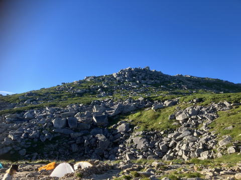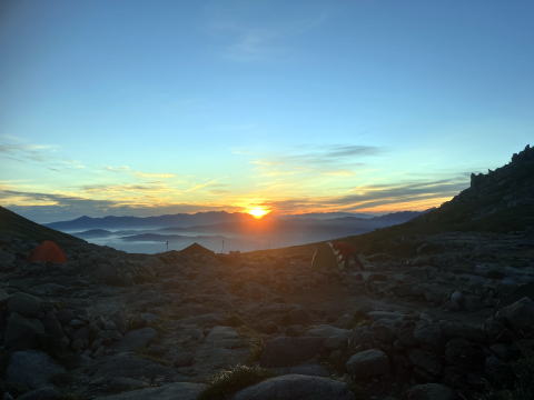 | 乗越浄土まで普段の1.5倍程度の時間を要した。さらに頂上テント場まで約1時間かけて登って行った。テント場到着15時30分頃だったか。 テントを張って、早めの食事にした。本日は頂上付近ガスが出ているので、登るのをやめた。 2025.8.18 2日目 朝テントを7時までに畳まなければならないことになっていた。4時ころから起きて日が明けるのを待った。 本日は、快晴だ。頂上方面も全くガスは出ていない。 |