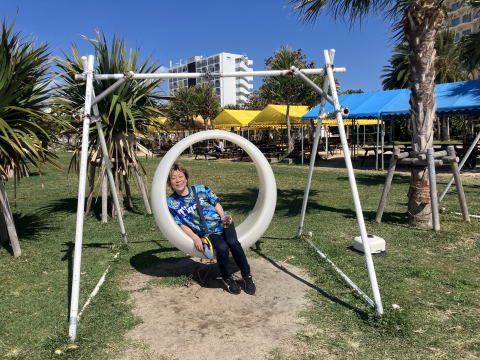 | 2026.2.10(火) 本日は、メンバーに中日ファンもいるし、中日ドラゴンズのキャンプ地北谷球場へ。昨日までと打って変わってやっと沖縄らしい天気となった。メンバーも特に練習に興味を示さず、近くのビーチや「アメリカンビリッジ」(飲食等のできる商業施設)に行って楽しむ。 青い海と青い空、これぞ沖縄といったキャンプ地だ。 |