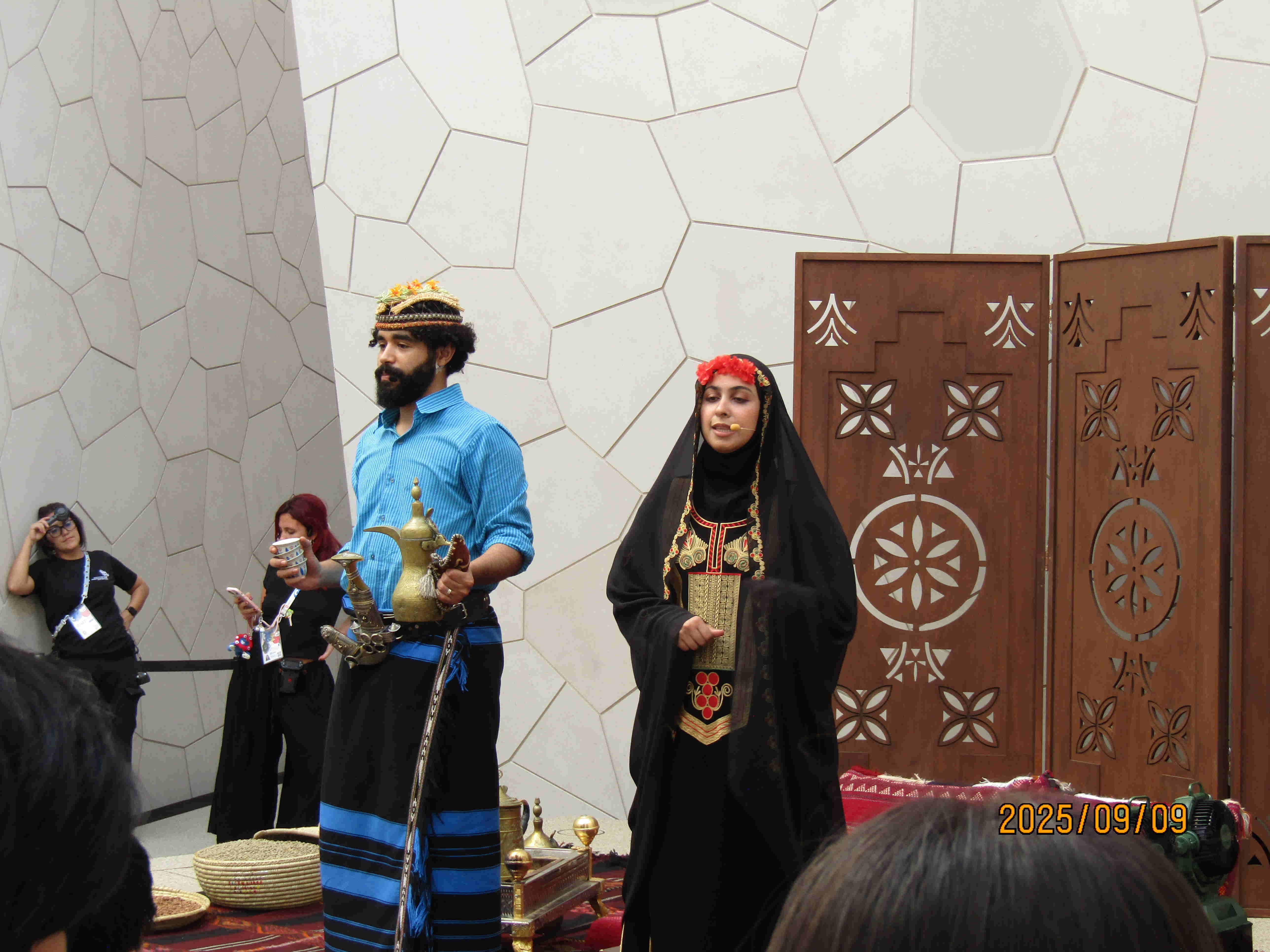 サウジアラビア館では、入館してすぐの広場で寸劇があり、サウジアラビアなまりの英語で、サウジアラビアでは伝統的に来客には美味しいコーヒーで