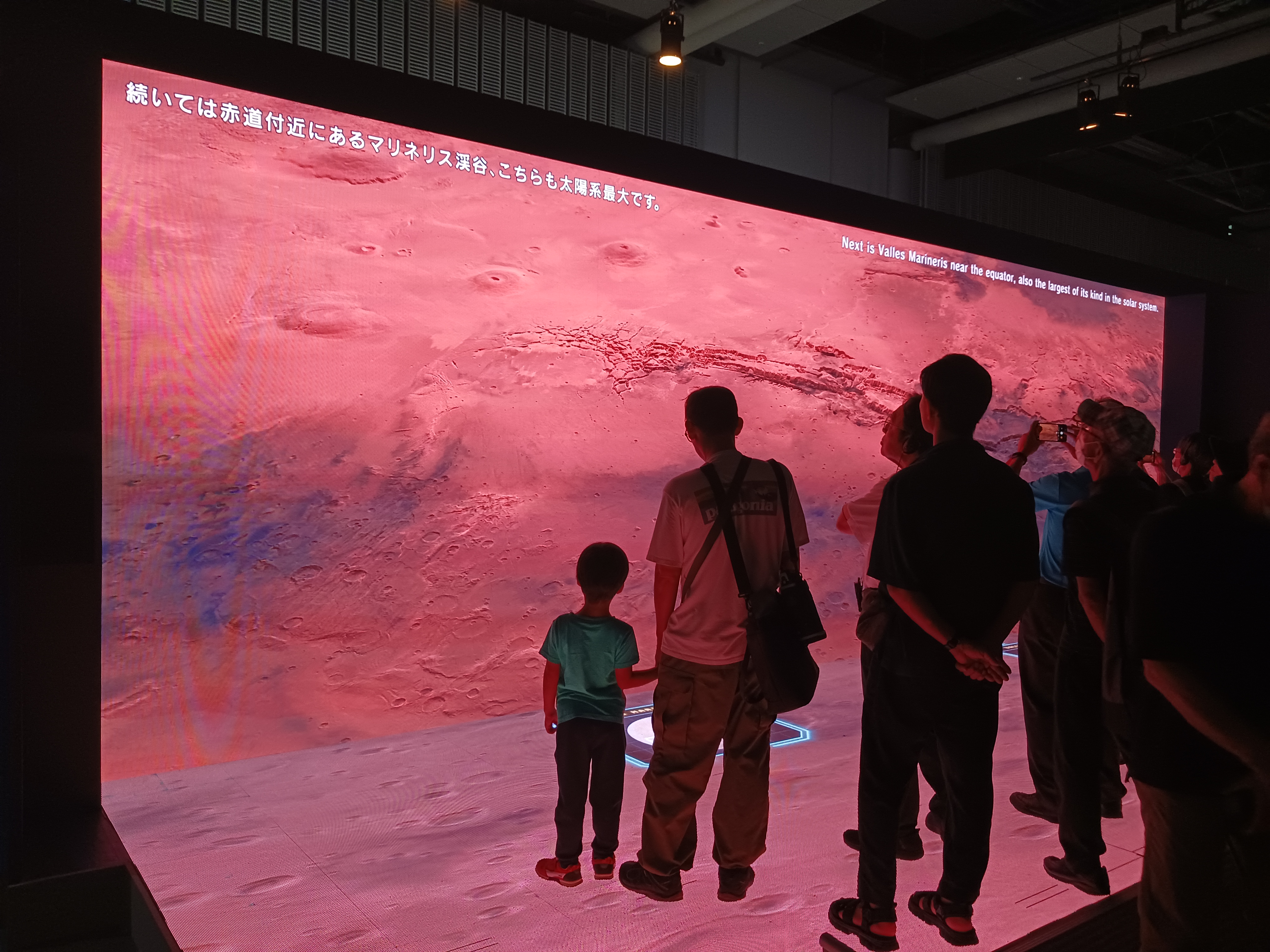 特に、火星のマリネリス峡谷の実際の映像を基に再現された大画面では、自分が浮遊物に乗って、峡谷内を飛んでいるようにつくられて、少なからず