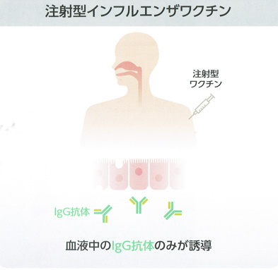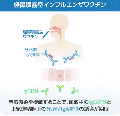 ❏従来のインフルエンザワクチンと点鼻ワクチンとの違いについて:分泌型IgA(局所免疫)は鼻粘膜の外分泌液中に含まれウイルス進入時に粘膜の防御に働きます。非分泌型であるIgG抗体(全身免疫)は血液や体液中に存在し一度感染した病原体を記憶して再感染時に素早く排除する二次免疫応答として働きます。従来のワクチンが血中IgGのみを誘導するのに対して点鼻ワクチンはIgA(局所免疫)とIgG(全身免疫)の両方の誘導が期待できます。