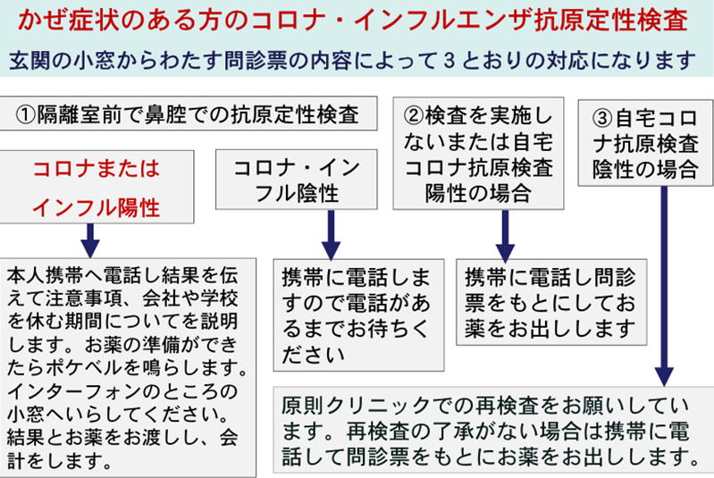 ▮インフルエンザまたはコロナ抗原定性検査が陽性となった場合には発熱ないし症状の出現した日を発症日として翌日から5日間の自宅待機となります。家族の濃厚接触者扱いはなくなりましたので家族は発病者とは居宅内での隔離は必要ですが、家族の出勤登校停止期間はありません。