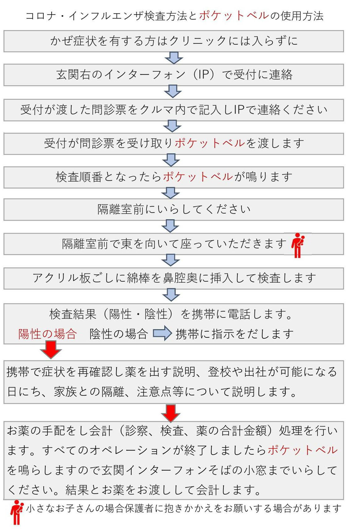 ▮お子さん(0歳~5歳くらいまで)の検査には保護者の方の協力をお願いいたします。具体的にはお子さんを前向きで抱っこしていただき手とおでこを押さえていただきます。検査用の綿棒を鼻腔に挿入した時にお子さんの手が払いのけようとするのと頭を振るのを防止するためです。よろしくお願いいたします。