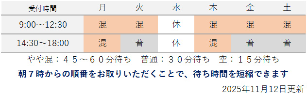 お呼びできる時間の目安と現状の混み具合です。インフルエンザ、コロナ抗原検査が1日に25件ほどです。朝の7時の診察順番 をお取りいただいて時間を見計らって受診ください。1時間で10から15人程の進行状況とお考え下さい。火曜日は院長と非常勤医師の2人態勢ですので比較的早くお呼びできます。