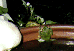 一泳ぎし汚れを落として水からあがる雌ガエルと側で休む雄ガエル