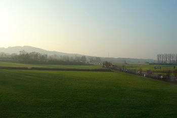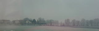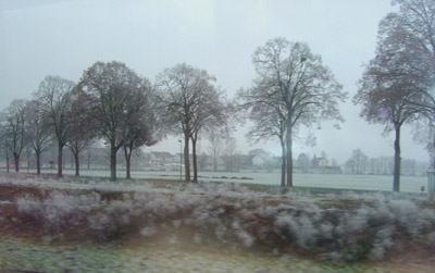 | ロマンチック街道をひた走りましたが曇り空の下道路沿いの農地は霜が降りて時々グレーに染まる幻想的な風景が広がり中々素敵・・・ バスのスピードとシャッターチャンスのタイミングが合わずかなり焦りながらやっと一枚だけ、雰囲気がつかめましたでしょうか? 北海道の十勝に良く似た雰囲気も所々に見られて。 |