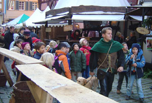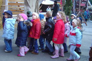 | ここのクリスマス市は店の人たちがみなそれぞれに中世の服装をしていて、校外学習というところでしょうか犬を連れたつれた青年が子供達に店先でなにやら講釈?を。 とても興味があったのですがガイドさんもその理由や内容は知らないとのことで残念でした。 ヨーロッパの子供って可愛らしい! | |