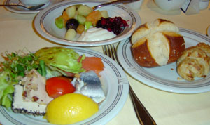 | 連れと4人で歩き回った挙句に入ったイタリアンレストランでは大きなピザを一人で食べちゃうドイツ人の食欲に ビックリ。 2つで充分と思ったけれど悪い気がしてパスタもひとつ頼み4人で必至で食べました。 この日のホテルはかなり立派で雰囲気も良くて満足♪ おまけに翌朝の食事メニューの充実ぶりはちょっとしたパーティ?と思うほど豊富で、鳥や豚肉料理には手が出ない私としてはここぞとばかりチョット欲張ってあれこれ味わってみました。 旅の間中共通してドイツパンの美味しいことと言ったらパン好きの私にはたまりませんでした〜♪ |