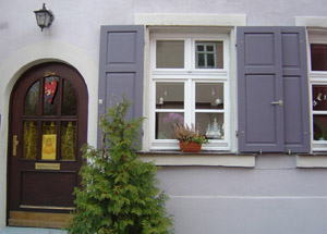 | 運河に囲まれていたのかどうか、門をくぐるとそこは中世の町といった感じの小さなかわいらしい町、ディンケンスビュールです。 小さな通りにパープルの窓べがとってもオシャレな感じ。 |