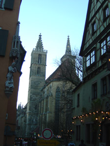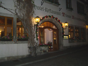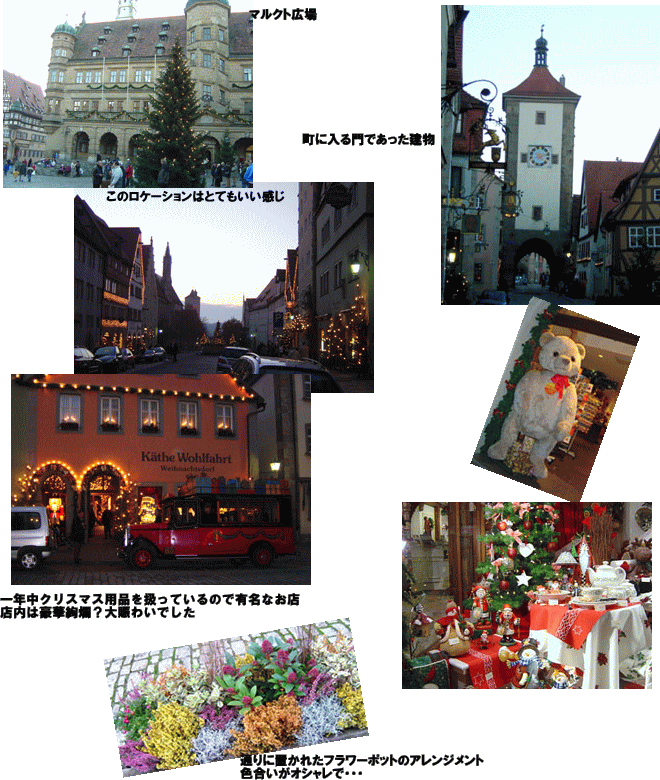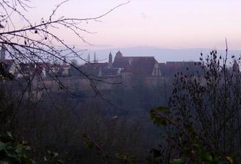 | 夕暮れ前にローテンブルグに到着。ここもまた城壁に囲まれ石畳が年代を感じさせる素敵な町。 プチホテルといった感じのロマンティックで可愛いホテルに宿泊でした。 荷物を置いてメインストリートへ出た時にははや薄闇が降りはじめたのでまずは町周辺の風景をと大急ぎ・・・ |