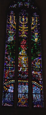 ドナウ川流域の要所であったことから富が集中し教会の意向ではなく市民の力で建造された大聖堂とのこと。 色々な説明から市民の自治力が受け継がれている町である印象を受けました。 先の大戦では町の3分の2が破壊されたにも拘らずいち早い復興を遂げて、ステンドグラスも新しく作られ続けているのですが、これはユダヤ人大虐殺の反省をこめたモチーフが描かれている窓。 アインシュタインの生地でもあり別の窓のモチーフには彼の難解な数式が描かれていたりでとても斬新でした。 ここでも先の大戦のダメージから反省、再生へと戦後のドイツ人の確とした「意志」を感じさせられて・・・ |