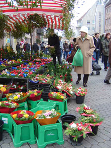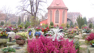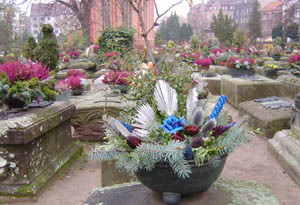 | なぜか一番最初はドイツの天才画家(知りませんでしたが・・・)デュラーのお墓参り。 墓地はきれいなアレンジメントに溢れてお花畑のようでしたが、夏にはもっと色とりどりのお花が供えられ 近隣の人たちが水遣りをしていつも美しいとか。 お彼岸、お盆だけお花が添えられ大半は物悲しい雰囲気の日本のお墓事情との差を思うと少し 恥ずかしいような。 |