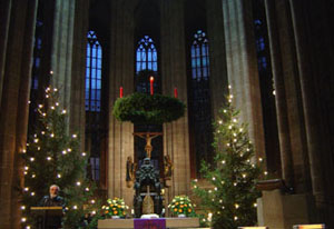 カイザーブルグ城の後見学した聖ゼバルドス教会で行われたミニコンサート。 まだ買い物が終わらない友人と離れて一人で聴きに行きました。 4人の管弦楽演奏の後、パイプオルガンの演奏にあわせて参集者の美しい歌声が教会内に広がり、言葉は分らなくても荘厳な響きに身が引き締まるような感動がありました。 違った意味で素敵なクリスマス気分に浸ることが出来て何よりの旅の締めくくり。 |