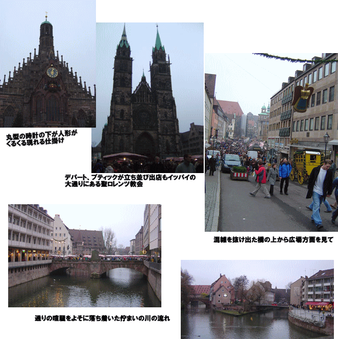 | 中央広場のドイツ最古の仕掛け時計が見られるリーブラウエン教会前は丁度土曜日だったせいかマーケットの買いもの客と観光客で大混雑でしたが、お連れの後にくっついて丁度時報を告げる鐘の音とともに始まった仕掛け人形の登場を見ることが出来ました。 最後のフリータイムで入ったデパートも日本の年末さながら状態で包装はあちら、免税手続きはそちらの階で・・・と連れの友人は汗をかいて右往左往。気がつけばお昼も抜き!ここで一旦別行動となりました。 自分の買い物を済ませて通りに出ると人波はますます膨らんでいて年末の浅草かアメ横といった賑わい方。 時間が経つにつれグリューワインやソーセージ片手に食べたり飲んだりしながら歌を唄う人など・・・ もう気分はクリスマ〜!!という雰囲気に満ち溢れてきてこちらまで楽しくなってしまって。 |