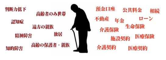 成年後見制度とは、認知症,知的障害,精神障害などによって物事を判断する能力が十分ではない方の判断能力を補い、その方を法律的に支援する(成年後見)ための制度です。成年後見制度には、すでに判断能力が低下したために成年後見人等を選任する「法定後見制度」と、将来の判断能力の低下に備えて後見人を選任しておく「任意後見制度」があります。