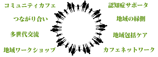 「2丁目カフェ」、「認知症サポーター養成講座」、「各種機関主催ワークショップ」、「野々市コミュニティカフェネットワーク」等の活動を通して、地域のつながりを醸成し、支え合いのある地域の実現を目指します。