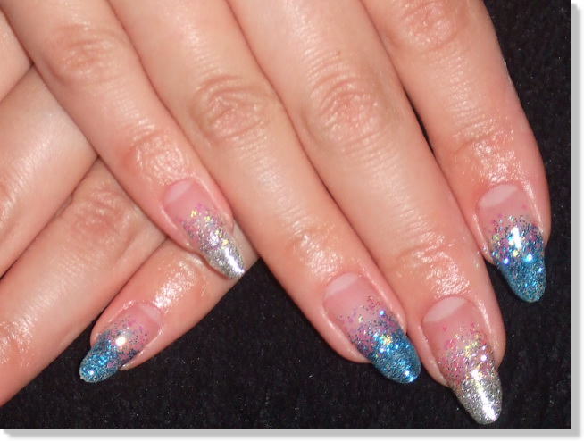 ![]() ホロを入れたブルーとシルバーの ラメを交互にのせたジェル |