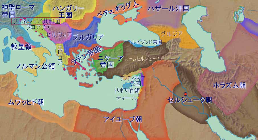 サラディン、ダマスカスで死去(55歳)。アイユーブ朝の分裂。内紛後、弟のアル・アーディルが再統一。*1 |