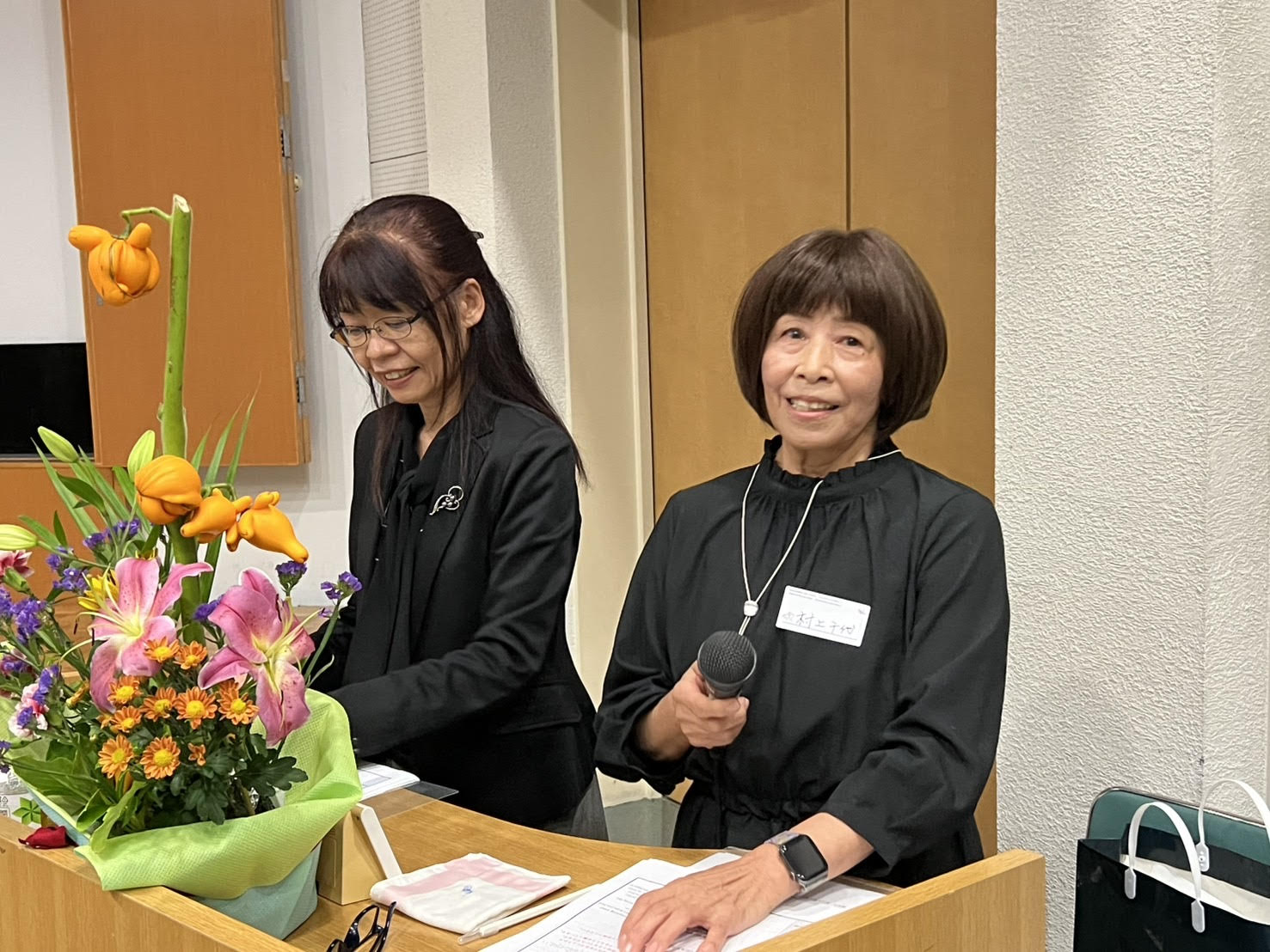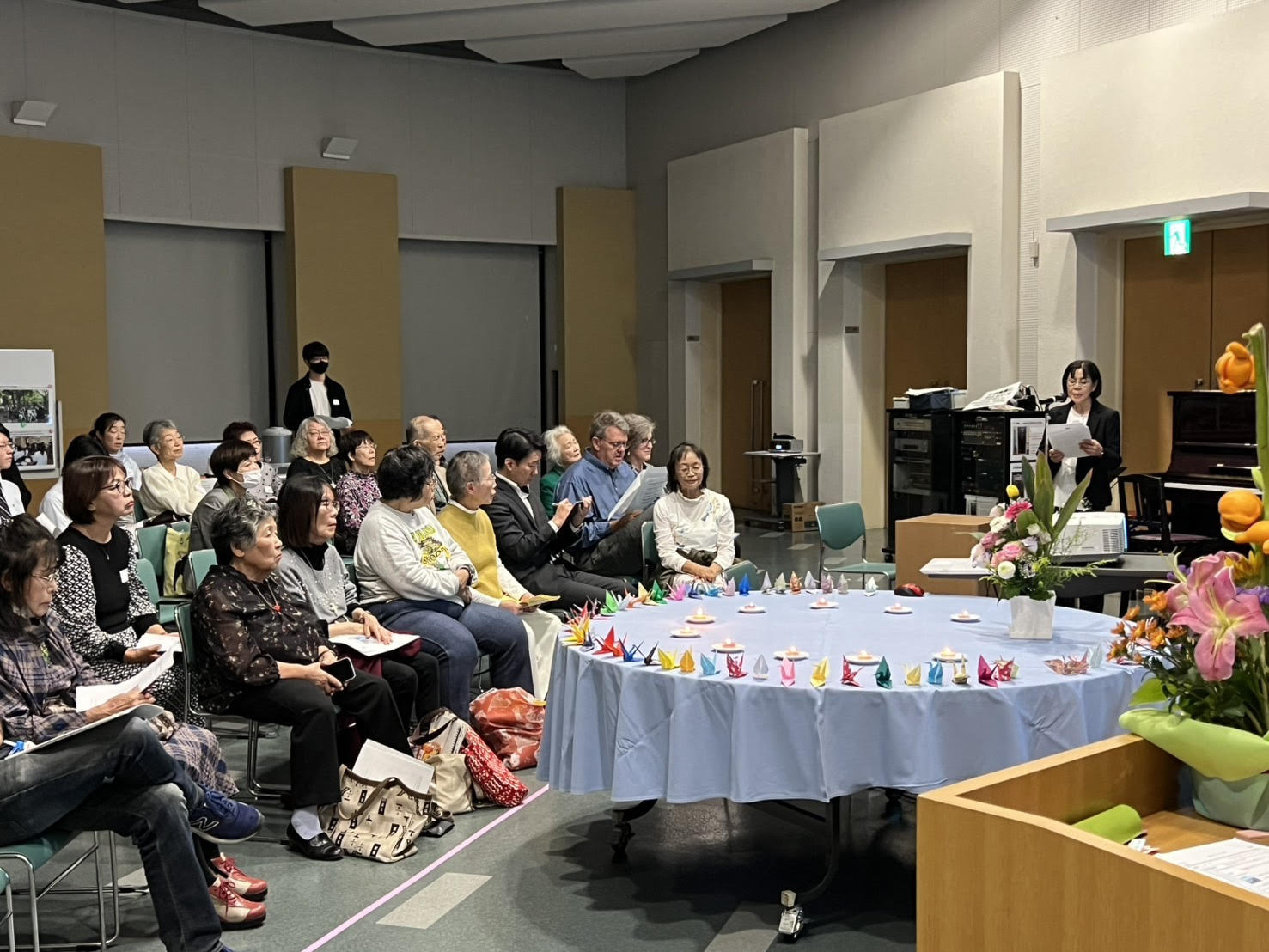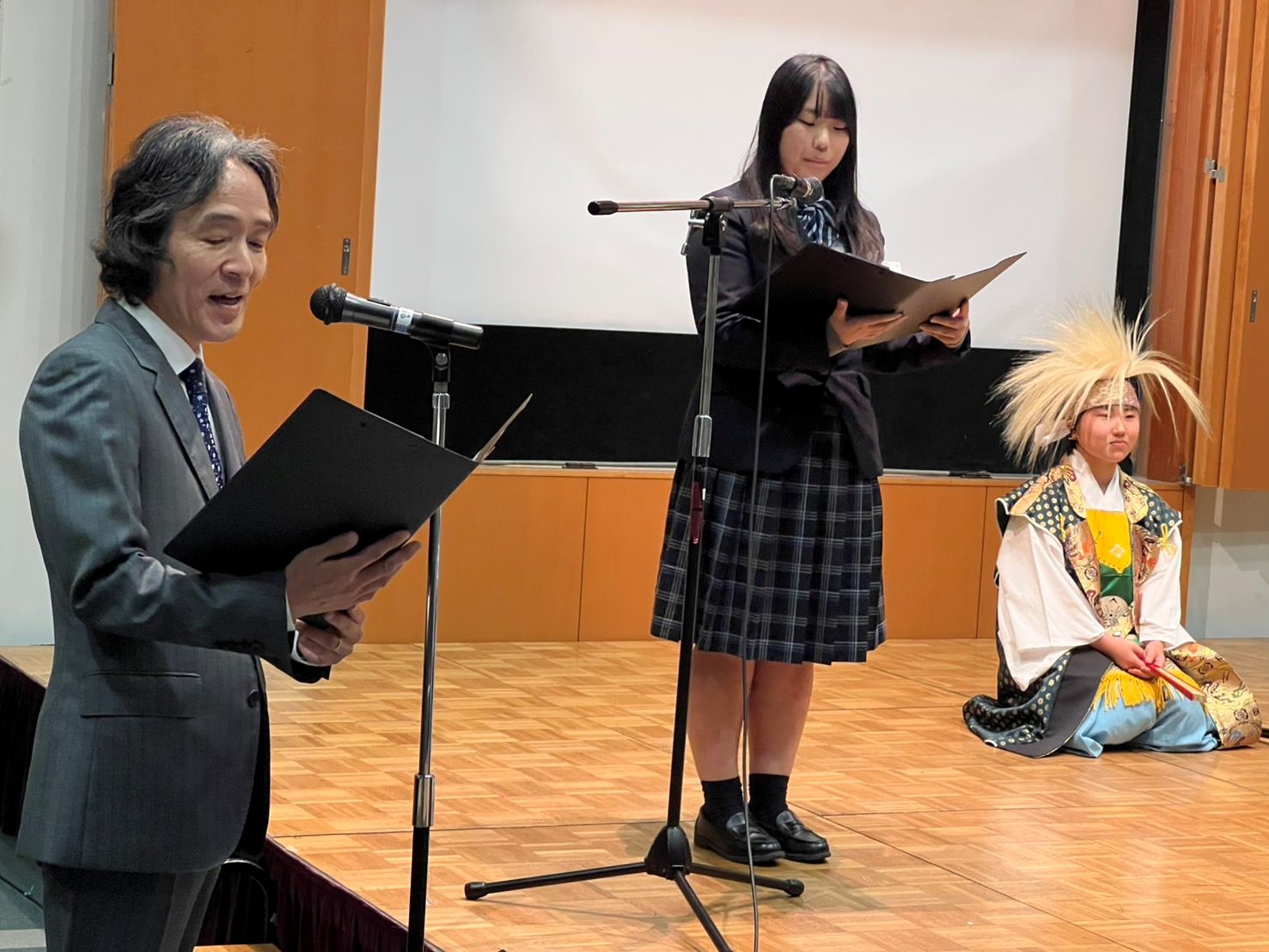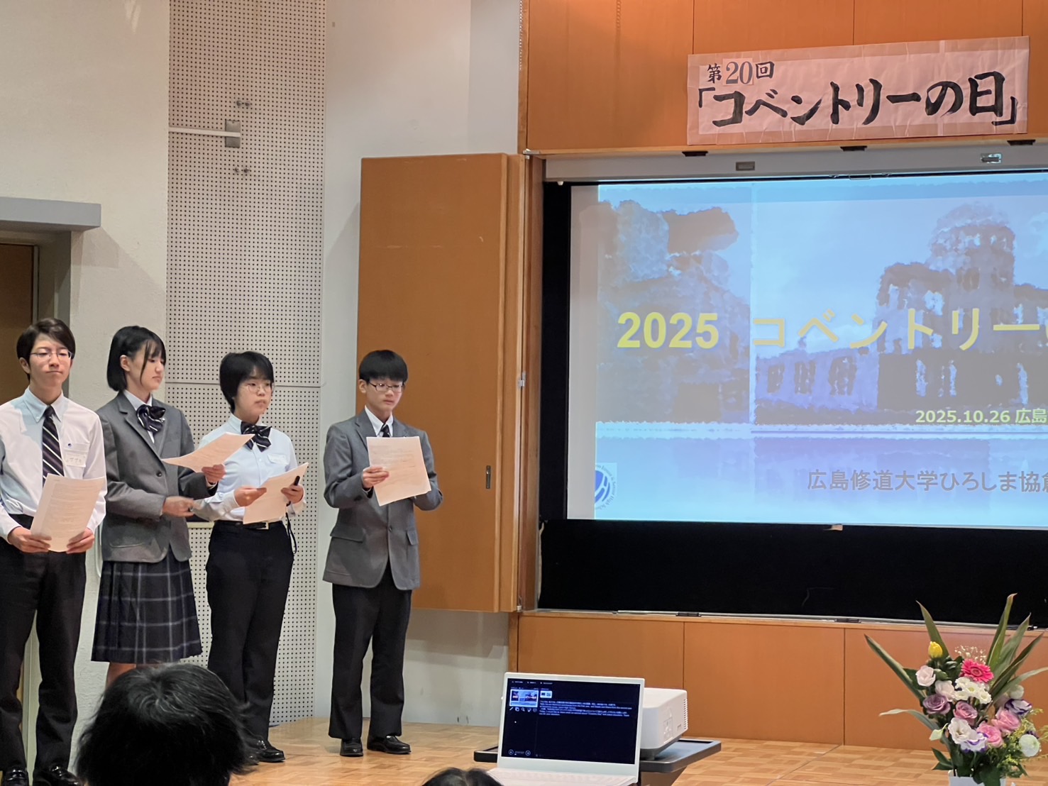 コベントリー会企画の灯籠プロジェクトの取り組みを発表する協創中学校生徒 |
