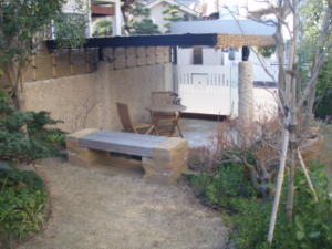 ライト・電源も配置しているため外に出るのが心地いい季節には施主はこちらで仕事をされています。足元の洗い出しはおくにいくほどラフな仕上げに。