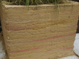 | 版築風仕上げで丸と四角のプランターを、三角は古瓦で、モミジ・イヌマキ・ホソバヒイラギナンテン・下草類で空間を構成。 | |