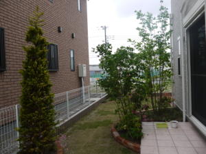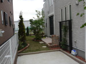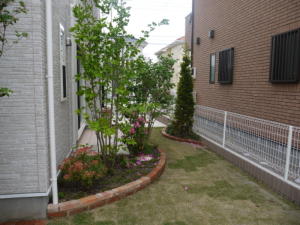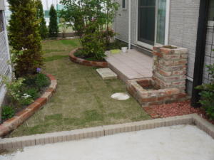 レンガと芝生を主体に視線にこだわりより広く、使って楽しい空間を植栽によって演出。 |