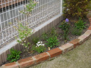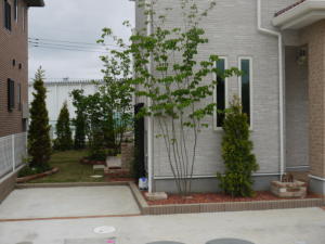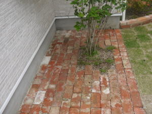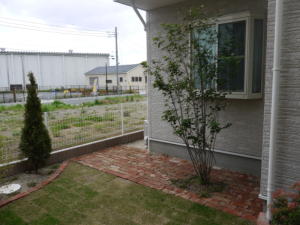 古レンガを使用したテラス・・・目隠しと日よけを考慮しオトコヨウゾメを植えて・・・