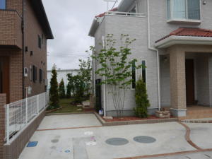 ■レンガ・芝生・コニファーといった洋風ととられられがちな空間を日本庭園的な空間処理と雑木類で味付けしより深みがあって楽しめる空間に。。
