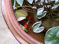 コメットはとっても元気。鉢の淵をたたいてから餌をまいていたら最近は