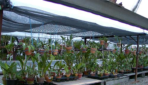 それでも毎日35℃以上の日が続き、とうとう、温室の中も外の棚も50%遮光を2重張りにしました。
