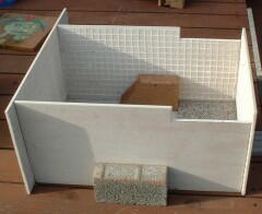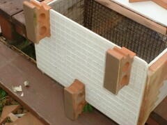 | 側面に取り付けるために、内側に受けを作成 飛び出した部分に、網をかける タイルに穴をあけるのも大変 2穴で4時間、振動ドリルを借りると1時間 |  |