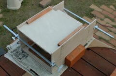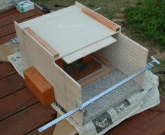 | 裏側の1面だけは、スライドできるように枠をつけないでおいた が、スライドさせる必要はなく、かえって煙がもれるので縁をつけ ることにした