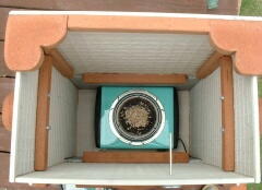 上蓋からのぞくと電熱器とチップが見える 下の段にも網を敷いて油受けをのせる 温度計は挿してあるだけ 上蓋はこのように引っ掛けて作業ができる |  |