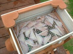 | 上段の網に食材を並べるかつるす 並べてあるのはイカ 300Wで温度は50度〜60度 600Wにすると70度〜80度 温度を高くすると電熱器自体も熱くなる |