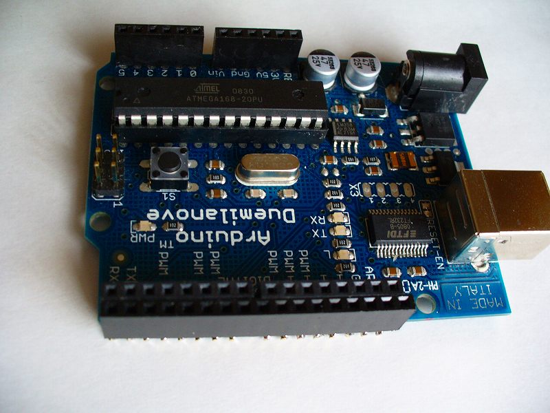 Aruduino Duemilanoveはピンソケットを並べて半田付けすれば良いのか!そうすれば普通の穴あき基板が「小亀」になれるんだ。