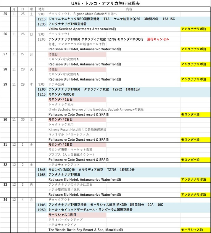 モロンダバ空港行の便が1日早まった理由を調べてみると、「旧フランス領土(植民地)の国々の会議をアンタナナリボで開催するので、各国の要人の特別機が11月26日にアンタナナリボに集中して到着します。そのため一般機の離発着を制限します。」とのことでした。すご~く迷惑な話です。