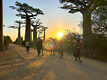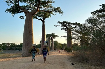 「バオバブの並木道」です。写真等でよく見る景色ですね。観光客が多くて、お土産品店やカフェバーもあって、観光地化されていました。また現地の人にとっては生活道路で、女性は頭に荷物を乗せて運んでいます。で、裸足の人が多かったです。ここでは行きと夕刻の帰り、2度寄って写真を撮りました。