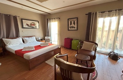 1時間くらい車で走ったら、ホテル(Valiha Serviced Apartments Antananarivo)に到着。4つ星だったので安心していたら、とんでもありませんでした‼ 洗濯機があるとBooking.comの説明書には書いておきながら、濯機はありません。しかも、一晩中、モーターの回転音がするし、エアコンと言う名の「氷に風を当てて冷風を発生させる扇風機」しかないので(エアコン有りに騙された)、騒音と暑さでゆっくり眠ることが出来ませんでした。極めつけは、ホテル近くの歩道でボロ布をまとった若い女性が転がっていたこと‼ 死んでいるのか?生きているのか? ギョッとしました。