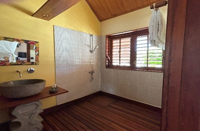 ホテルのフロントを抜けるとプールとレストランがありました。ビーチを歩いて部屋に移動しました。荷物はポーターが肩に担いで運んでくれました。コテージと呼ぶには外観が貧弱ですが、内部はしっかり整っていました。