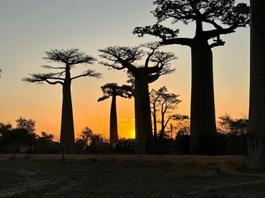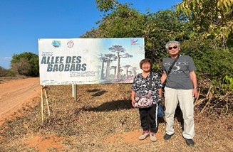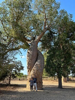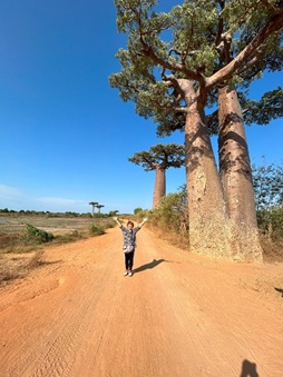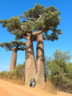 モロンダバに到着した本日(11月29日)、まゆちゃんは、やっと念願のバオバブの木を見ることができました。本来なら今年(2023年)1月、クルーズ船にっぽん丸でマダガスカルに寄港して見るはずだったのですが、COVID-19 に感染したために強制下船となり、見ることが叶いませんでした。あの日からずっとリベンジを夢見てきて、このたび実現できたので、すごく嬉しそう。感激している様子。ようちゃんは1月に見たもんだから、「あんな辺鄙な所に行きたくない。」と思いやりのないことを平気で言ってました。その言葉に引きずられて、アンタナナリボでは、モロンダバ行きを一時諦めかけたけど、諦めなくて良かった‼ 「ツインバオバブ」の木に到着しました。根本は1本ですが、その上は2本の幹が出ています。