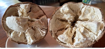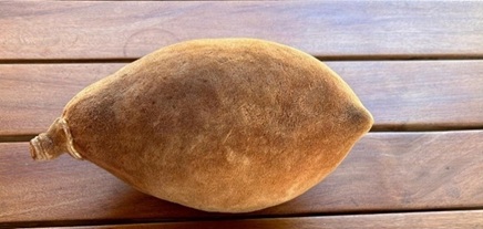 バオバブの実です。長さは約20㌢、太い部分の直径は約12㌢。茶色くてビロードのような肌触りです。割ると白いフワフワした種が入っていました。白い部分は食べることができます。少し甘くて、(子供の頃に食べたような)素朴な味でした。まゆちゃん一人で完食。