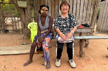 トゥクトゥクのドライバーさん(左)と仲良くなりました。私が顔に「化粧」をしている女性に興味を示していたので、通りすがりのバオバブ樹皮の化粧した若いお嬢さんと一緒に写ってくれました。さらに、バオバブ樹皮のお化粧をした女性と並んで記念写真を撮りました。私もバオバブ化粧をしてみようかな〜?