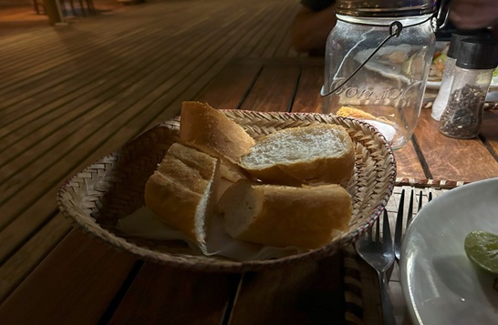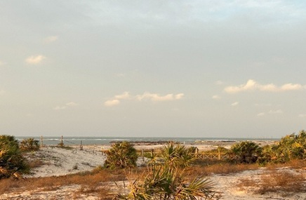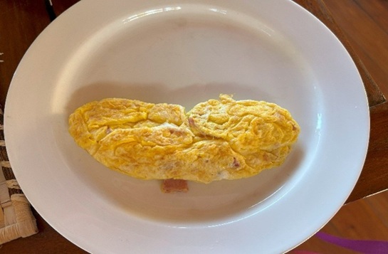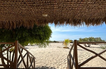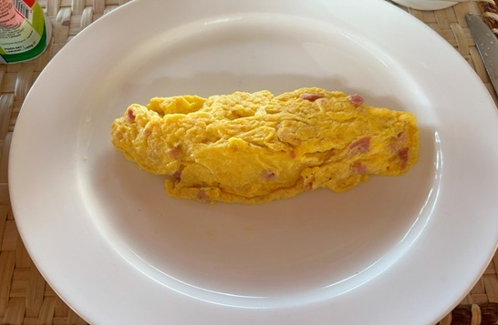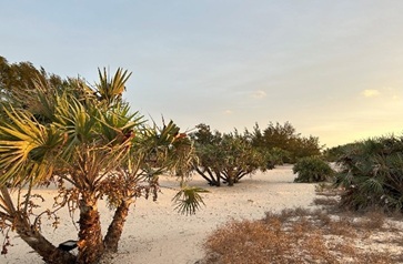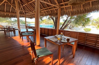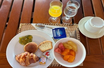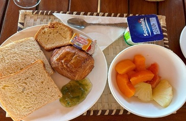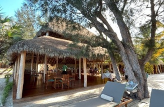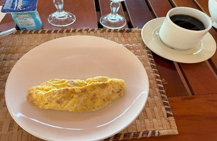 ホテル(コテージ)のテラスから遠くの海を眺めることが気に入りました。気温は30℃近くもあるのですが、風が吹くので暑さを感じません。鳥がさえずっていて、このまま、また眠りこけてしまいそう。コテージを出て砂浜を歩き、レストランへ朝食を食べに行きました。