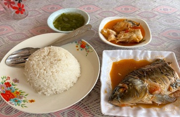 ようちゃんも、にっぽん丸では得られなかった経験ができたので、今ではとても満足そうです。帰りにドライバーにランチを御馳走するので、気に入った店があれば連れて行ってくれと頼みました。私達が泊まっているホテルの入り口近くにある定食屋に連れて行ってくれました。遠くから見ると清潔そうに見えるのですが、それほどでもありませんでした。ハエが飛んできて食べ物の上にとまっていました。ようちゃんは焼き魚定食、まゆちゃんは鯉の煮付け定食、ドライバーさんは魚の唐揚げ定食をそれぞれ注文しました。3人分の支払い額は、たったの500円位。一人前は170円程度です。安いのは良いけど、美味しいとは思いませんでした。ホテルの食事の方がずっと美味しいです。