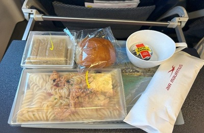 機内では、機内食が提供されました。ちょっと食べ慣れていないものだったので、食べませんでした。飛び立ってからそんなに時間が経たない内に、モーリシャスのシール・セイウッドザーギュール・ラングーラム国際空港に向けて降下が始まりました。街の明かりが見えてきました。
