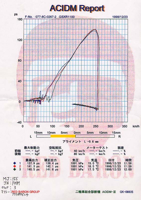 残念ながら、目標の140PS台をクリアできませんでした。 ま、キャブセッティングが前のマフラーのままなので、MJを詰めてやれば140台には乗るで