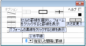 Label22.Caption = "↓水平線" Label23.Caption ="太さ変更 ↑" Label24.Caption ="↑フォームの黒線をクリックすると線を表示" Label25.Caption ="セルの罫線を選択し、フォームをクリックすると罫線を表示" |