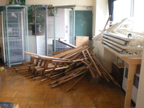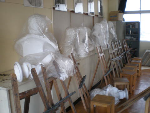 石膏像は割れるは、積んであった机やイーゼルはめちゃくちゃ、